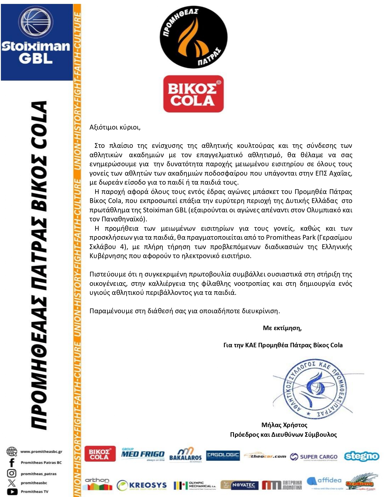 Με έγγραφό της η Κ.Α.Ε. Προμηθέας Πατρών, στα πλαίσια καλλιέργειας της αθλητικής κουλτούρας των αθλητικών ακαδημιών, δίνει την δυνατότητα στους μικρούς αθλητές των ακαδημιών των σωματείων-μελών μας για την παρακολούθηση όλων των εντός έδρας αγώνων στο Πρωτάθλημα της Stoiximan Greek Basketball League με δωρεάν πρόσκληση και των γονέων τους με μειωμένο εισιτήριο (εξαιρούνται οι αγώνες απέναντι στις Κ.Α.Ε. Ολυμπιακό και Παναθηναϊκό.